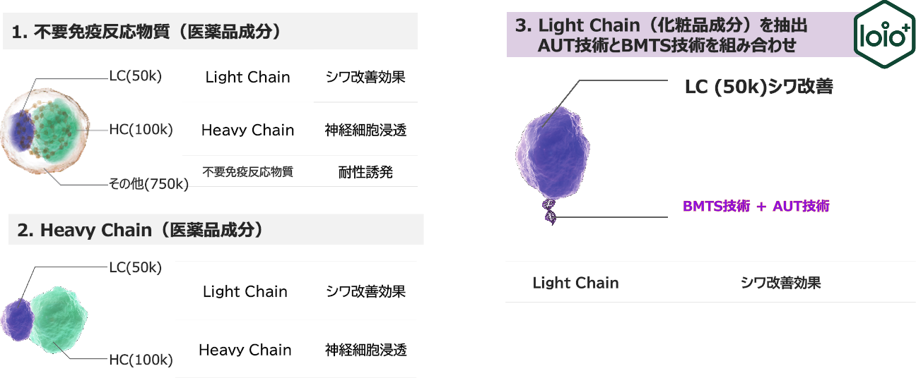 ボツリヌス毒素を加工した成分を使用し、医療用の製剤にしたのが、ボツリヌストキシンです。効果は筋肉を緩める作用があることから、顔面痙攣や眉間・目尻のしわ、食いしばりや歯ぎしりの改善など、さまざまな治療に使われており、美容クリニックの人気施術のひとつになっています。「医療研究所」BioPlus社は、ボツリヌストキシンに着目し、独自の特許技術を用いて、そのボツリヌストキシンからお肌にハリのある状態にする美容成分(LC:ライトチェーン)だけを抽出して作られた美容液の開発に成功しました。
